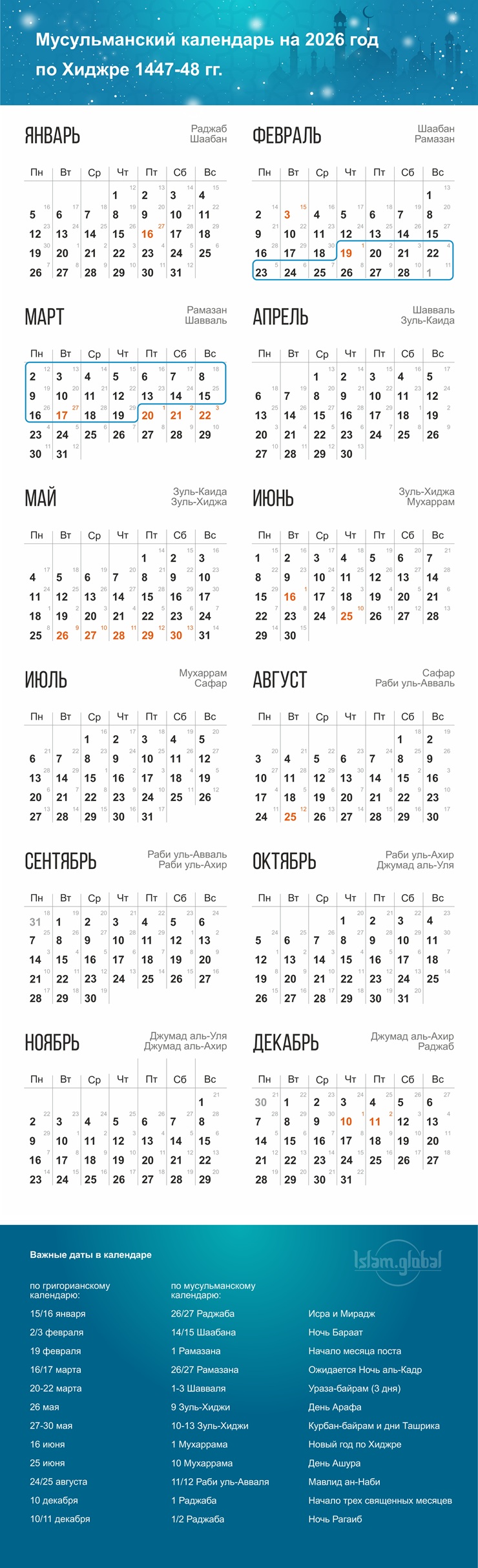 Вы можете также скачать в высоком разрешении и распечатать мусульманский календарь на 2026 год , в котором указаны все исламские праздники и важные даты.